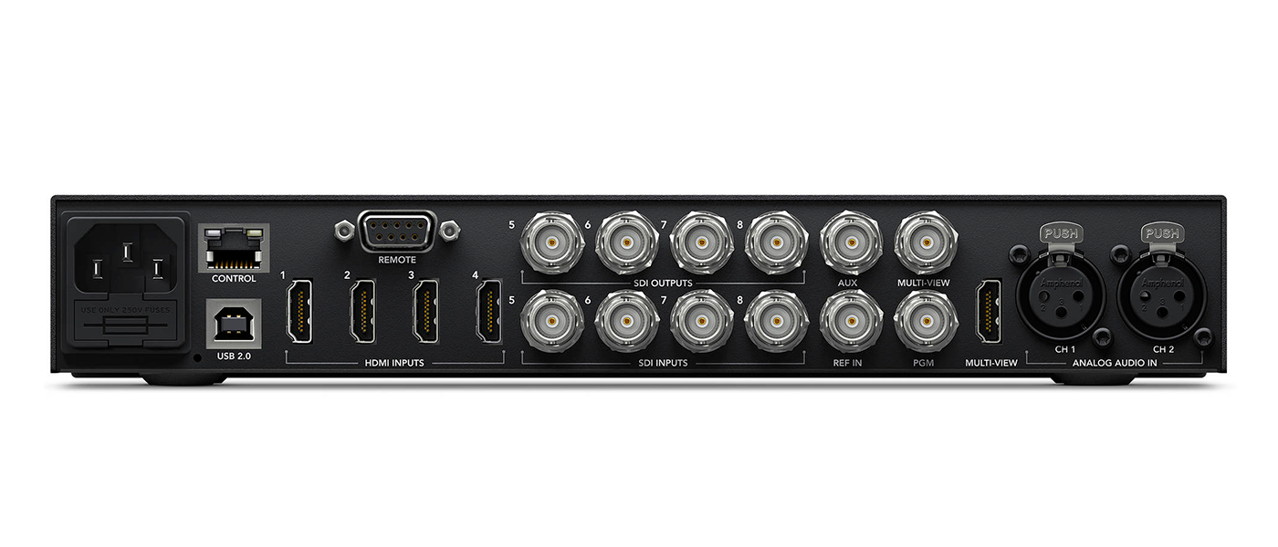 El panel frontal mantiene los controles esenciales al alcance de la mano, mientras que se puede acceder a controles y configuraciones más avanzados, como keyers ascendentes y descendentes, gráficos, medios y mezcla precisa para los 10 canales de audio disponibles a través de la interfaz USB o con un control ATEM. superficie. Muévase hacia atrás para revelar las conexiones BNC y HDMI para entrada y salida. Multiview se puede transmitir a través de SDI o HDMI para alinearse con la configuración de su equipo, y una salida AUX le permite enviar video a una pantalla externa, lo cual es ideal para eventos en vivo con una configuración de proyección. Cuatro de las salidas SDI tienen audio talkback integrado para configuraciones de estudio. Las cámaras Blackmagic Design Studio también se pueden controlar desde el conmutador para lograr una apariencia uniforme en todos los ámbitos.